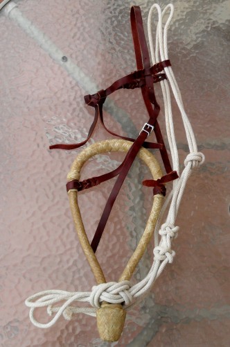 SOLD******New, old stock hackamore complete with light weight hanger and futurity knot browband plus a rope fiador throat-latch. The finely braided bosal has 5/8” twelve plait sides and Ύ” sixteen plait nose over a rawhide core. Just add your choice of reins or mecate and it’s ready to go. $55.00 includes shipping to the lower 48.