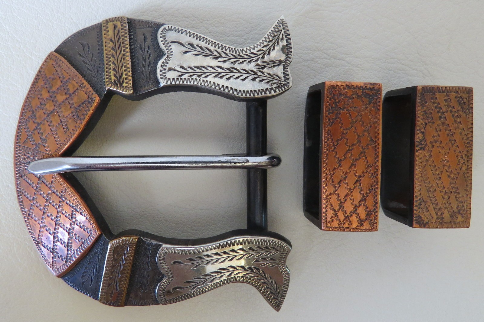 This is a new handmade three piece belt buckle set made by Stephen White from Plainview, Texas. Stephen started making spurs and cowboy hardware in 2004 and attended the Weyerts School of Engraving in Alpine, Texas to learn various techniques for overlay and inlaid engraving. Stephen is one of the spur makers selected to provide spurs for the Texas Style Bit and Spur Makers Association Woman’s Protective Services auction along with other top makers. The back of the buckle is marked S. White. The buckle is steel with a dark iron finish and is mounted with nickel silver, brass, and copper. There is engraving in the steel around all of the mountings and wheat stalks are engraved in the steel between the mountings. This would be a nice belt buckle to wear.