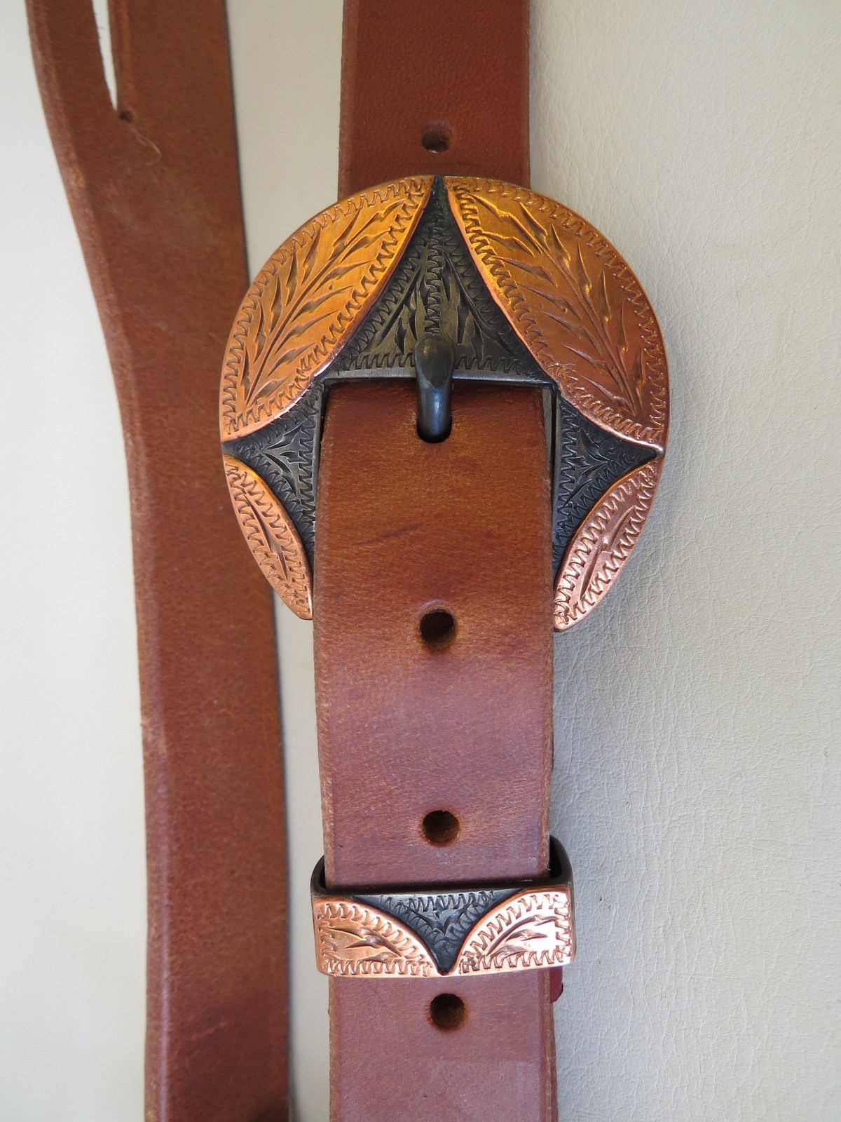 This is new handmade heavy harness shaped 1” slot ear headstall with a new handmade marked buckle. The headstall is made from heavy harness leather and the bit attaches with latigo tie strings. The edges are beveled and hand rubbed. It was made by a grumpy old cowboy from Happy, Texas. He has been building cowboy gear since the 1970’s. He does a really nice job. It is marked with his stamp. The buckle was made by bit and spur maker David Hunt from Panhandle, Texas and is marked with his stamp. It is steel with a dark iron finish mounted with engraved copper. There is engraving in the steel between the mountings. The buckle is attached to the headstall with latigo lace leather.