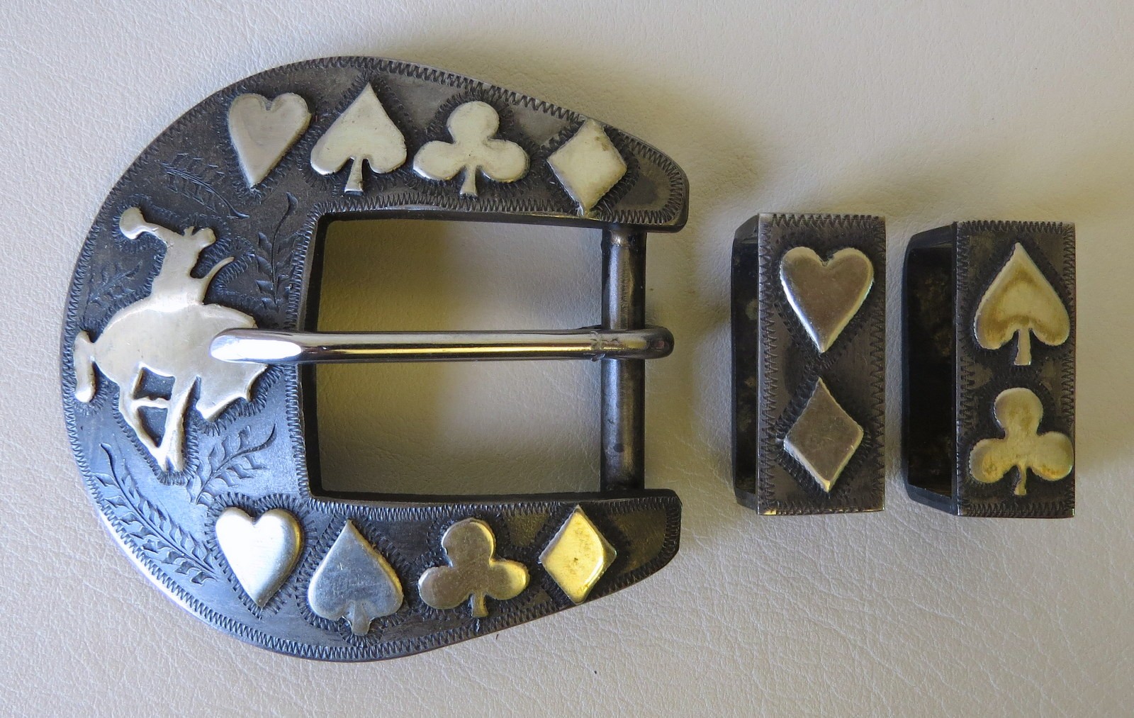 Handmade Bits & Spurs for Sale: 9106 New Handmade STEPHEN WHITE Three Piece 1” Bronc Rider Card Suit Belt Buckle SOLD #68064