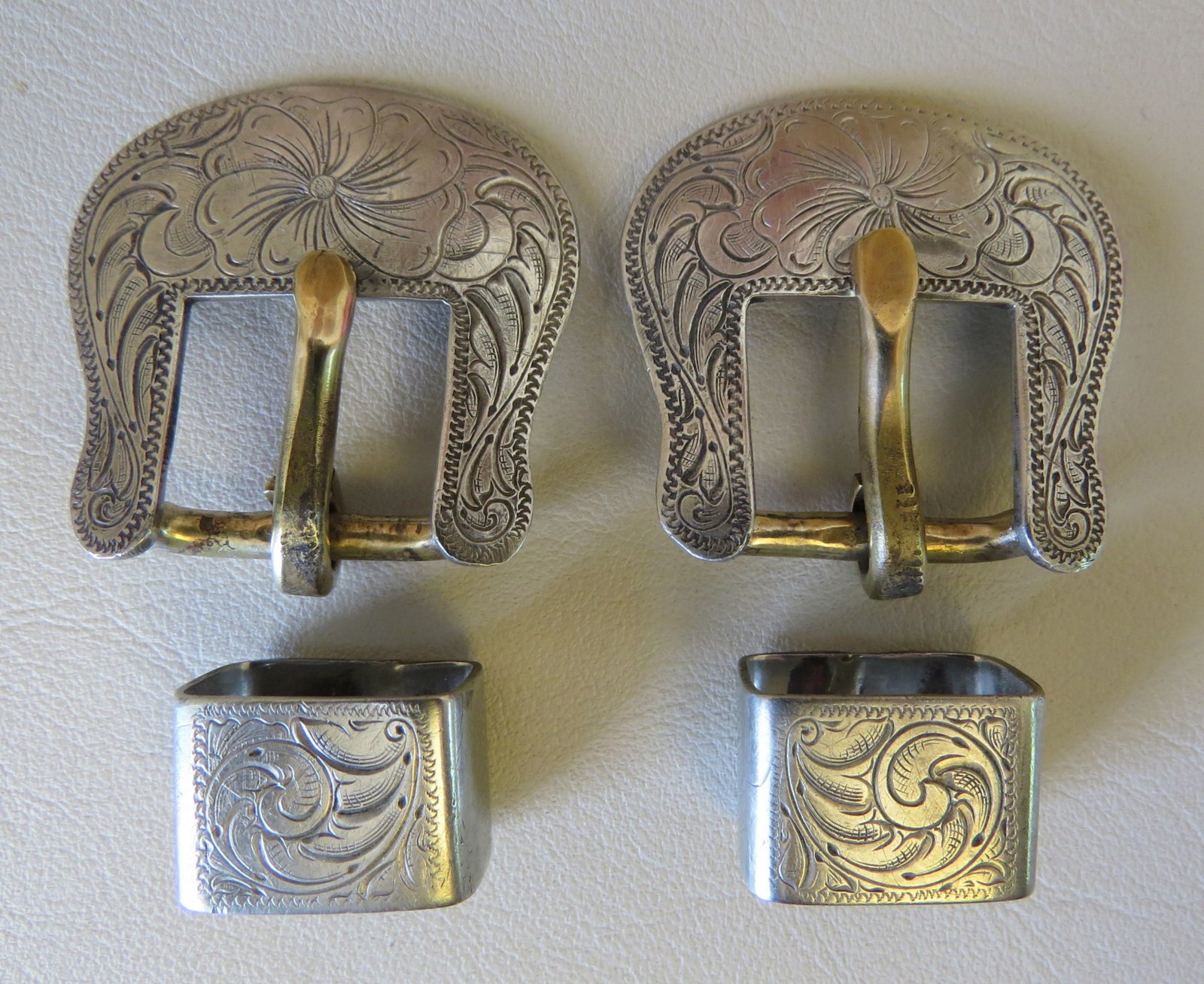 Handmade Bits & Spurs for Sale: 9115 Pair Handmade JOE ADAMS Engraved Nickel ⅝” Spur Strap Buckles SOLD #68087