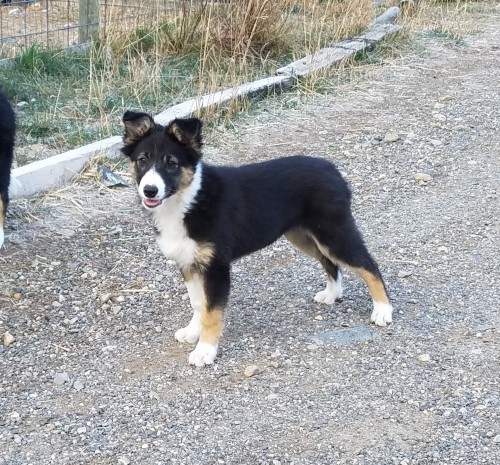 Tricolor, medium coat FEMALE pup for working home only. This pup should have exceptional eye, strong work ethic, is already demonstrating cleverness, determination, eye and speed. Sire is trial champion import from Scotland (Alad Owen bloodlines). Dam is daughter of Welsh/Scottish import also of trial champion lines. This is a repeat breeding.
