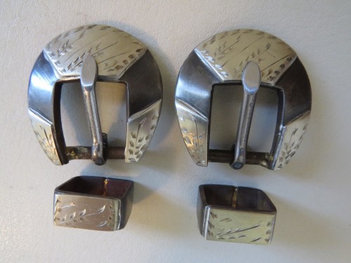 This is a pair of new handmade buckles made by Robert Evans. Robert is a bit and spur maker originally from Amarillo, Texas. His work is illustrated in Bits & Spurs Motifs, Techniques and Modern Makers by Ned & Jody Martin. Robert has been building bits, spurs, and cowboy hardware since 1994. The buckles are marked Evans and the steel is mounted with engraved nickel silver.