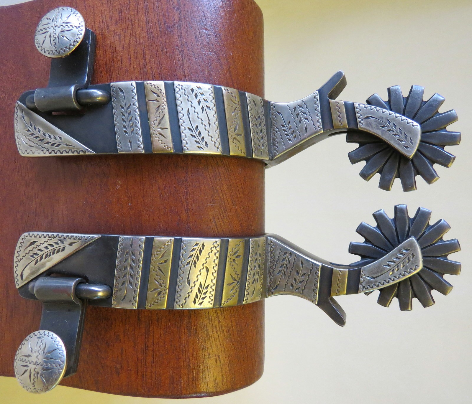 This is a new pair of handmade double mounted spurs made by Texas maker Mike Bednorz. Mike is a long time bit and spur maker from Dumas, Texas. He learned spur making from Terry Alward. He is one of the spur makers selected to participate in the Annual Texas Style Bit & Spur Association Auction to benefit the Women’s Protective Services Organization. They are marked Bednorz 155. The spurs are steel with a dark iron finish and are mounted twenty two pieces of nickel silver and eight pieces of brass. This is a nice pair of spurs from a very desirable Texas maker.