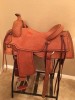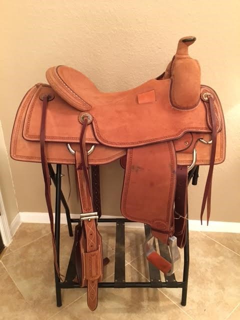 New Bob’s Custom Saddle. Great all around saddle. Designed by Dick Pieper. Perfect for ranch riding or ranch versatility and working Cowhorse. 16 in. Rough out, Running W border, silver conchos and strings, hard seat, loop seat, preturned stirrup leathers and aluminum stirrups! Retails for $3900.
