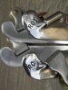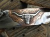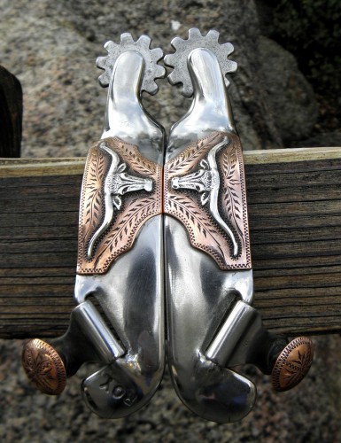 Nice pair of maker marked ROY stainless steel polo spurs mounted by AZ spur maker JD Moss. High polish stainless single mounted with copper overlay and sterling silver steer head, and a copper button cover; nicely engraved. Spurs have been re-roweled with 10-point rowels. Marked ROY on both heel bands. Very flashy, ready to wear or display.