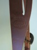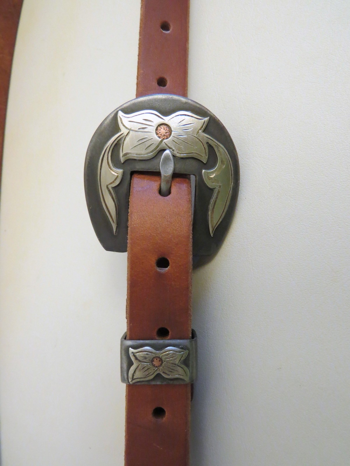 New handmade heavy harness leather shaped ¾” slot ear headstall with a handmade buckle made by Robert Evans. Robert is a long time bit and spur maker originally from Amarillo, Texas. The back of the buckle is marked Evans. It is steel mounted with engraved nickel silver with copper in the center of the flowers. The buckle is attached to the headstall with latigo lace leather. The headstall is made out of really nice quality heavy harness leather. The edges are beveled and hand rubbed. It has straight bit ends and the bit attaches with latigo tie strings. It was made by Grumpy Old Cowboy from Happy, Texas. He has been building cowboy gear since the 1970’s and does a really nice job. It is maker marked with his stamp.