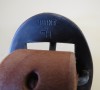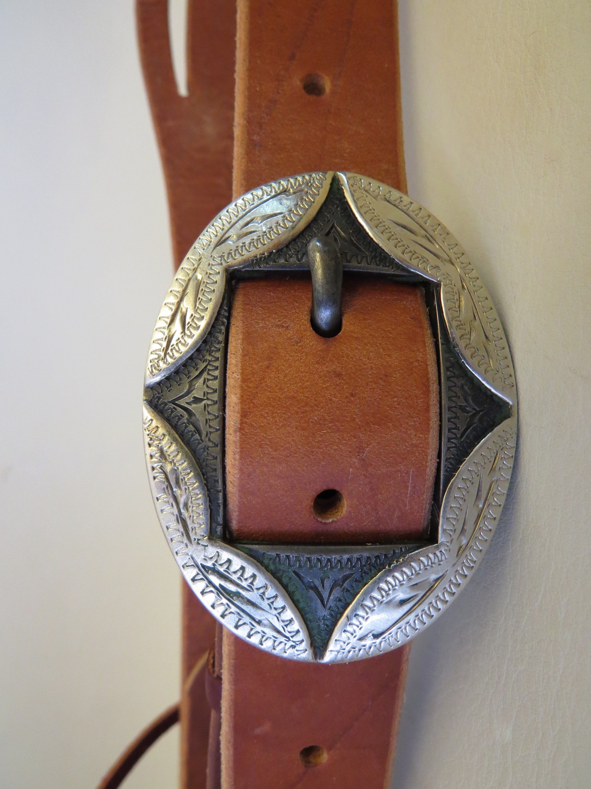 This is new handmade heavy harness shaped 1” slot ear headstall with a new handmade marked buckle. The headstall is made from heavy harness leather and the bit attaches with latigo tie strings. The edges are beveled and hand rubbed. It was made by a grumpy old cowboy from Happy, Texas. He has been building cowboy gear since the 1970’s. He does a really nice job. It is marked with his stamp. The buckle was made by bit and spur maker David Hunt from Panhandle, Texas and is marked with his stamp. It is steel with a dark iron finish mounted with engraved nickel silver. There is engraving in the steel around the buckle throat. The buckle is attached to the headstall with latigo lace leather.