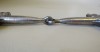 This is a new D ring snaffle bit made by Chris Hammack from Quanah, Texas. Chris is the owner of CH Bits and Buckles. The bit is marked with his maker mark CH and a cross and numbered 23. It is a well-made bit made out of steel and is mounted with nickel silver on the rings. The bars are inlaid with copper stripes. There some surface rust on the bit but it has not been used.