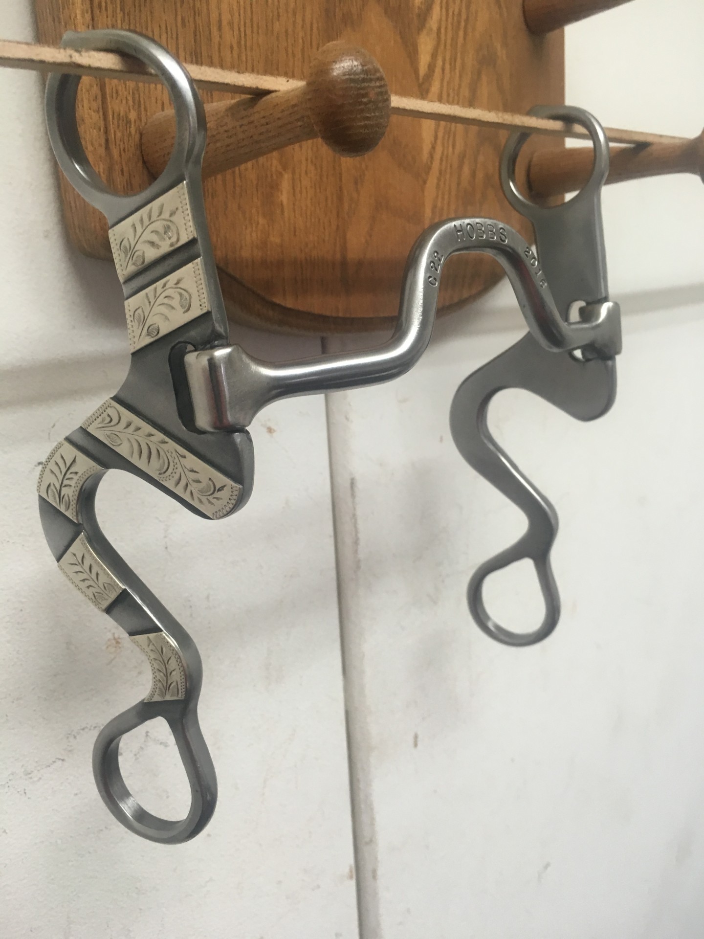 Unused mounted square port bit made by Mick Hobbs and marked C22 HOBBS 2016. 6 3/4" cheeks and 5 1/8" mouth. This is a very popular style of bit. We pay shipping within the 48 states and accept most forms of payment.