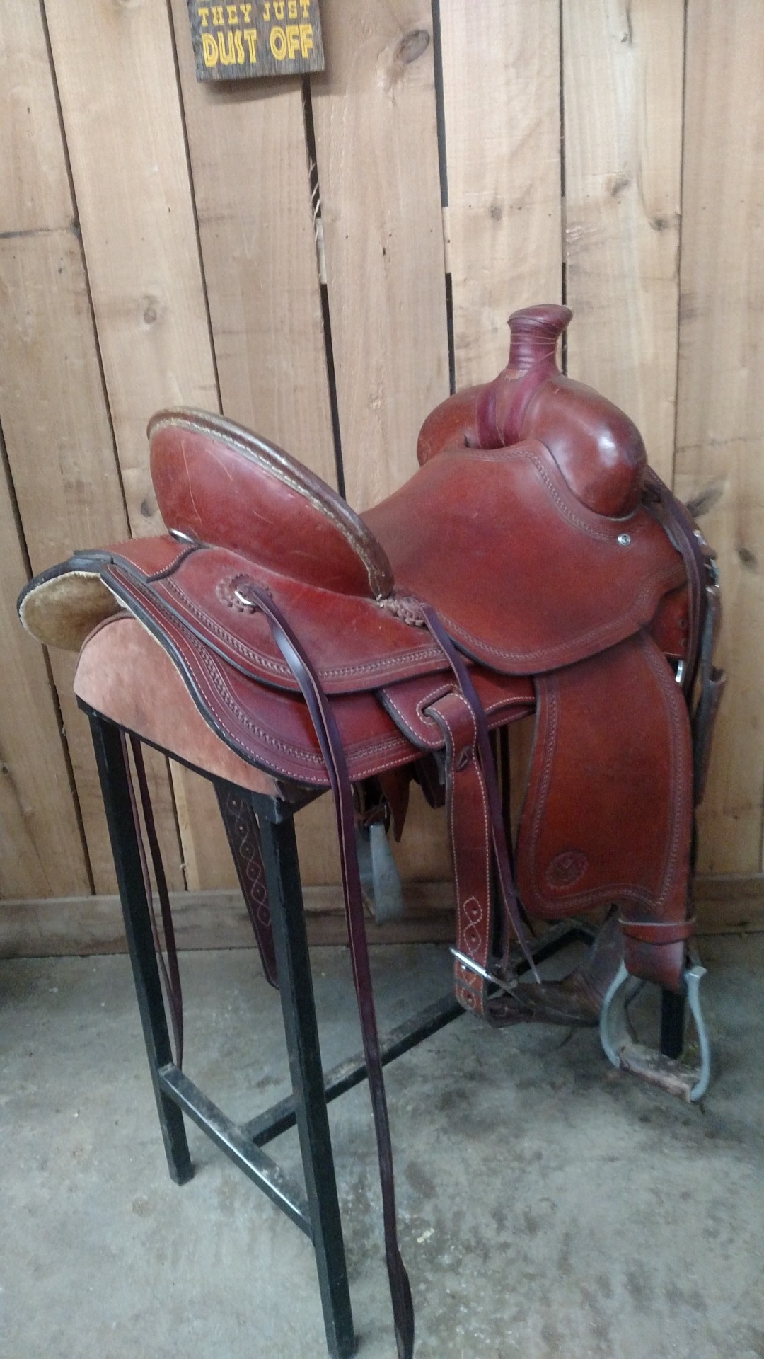 17 IN.SEAT WITH 5 IN.CANTLE,14 IN.SWELL,PLATE RIGGIN,ONLY BEEN RIDDEN A FEW TIMES, PRICE 850