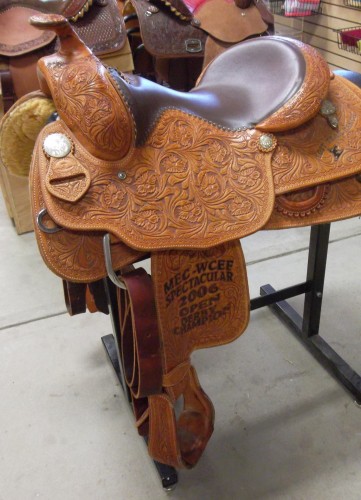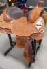 Beautiful tooled trophy reining saddle 15” Rocking T (Jim Taylor). Rocking T saddles are handmade, hand stamped, beautifully constructed saddles, made in Texas. This saddle has a padded seat, minimal silver accents and butterfly skirts. Very comfortable for horse and rider!