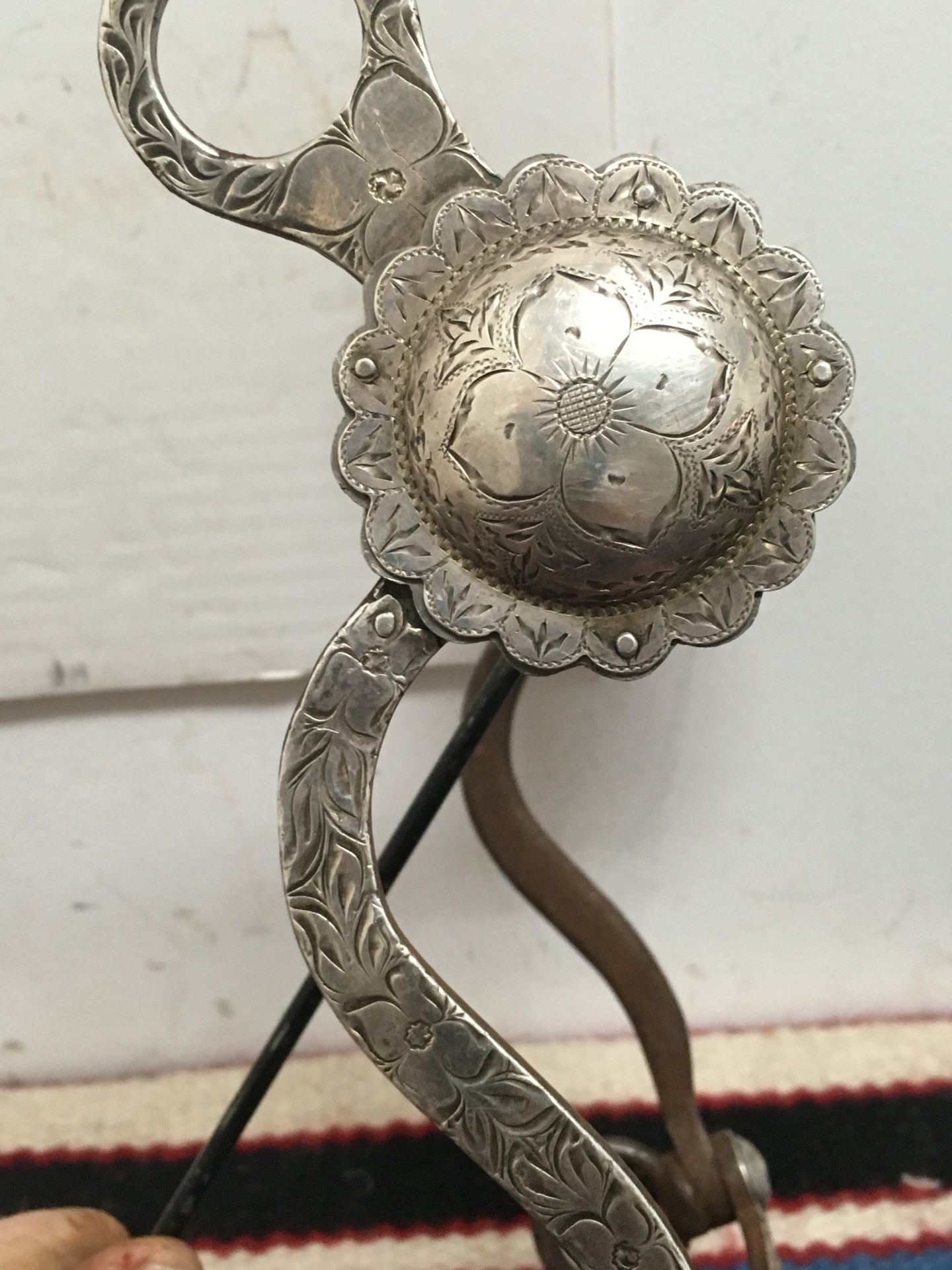 sale pending---CALIFORNIA CONCHO BIT: Vintage unmarked bit with some really good silver work and engraving. Bit does not show very much use. 2 1/4" sterling concho. Overlaid lip bar. 5" mouth. 7 1/2" cheeks. Cheeks have deep engraved sterling overlay. Very slight cant in the cheeks. Nice piece!! We pay shipping within the 48 states and accept most forms of payment.