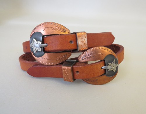 This is a new pair of stirrup leather hobbles with handmade buckles made by Robert Evans. Robert is a bit and spur maker originally from Amarillo, Texas. His work is illustrated in Bits & Spurs Motifs, Techniques and Modern Makers by Ned & Jody Martin. Robert has been building bits, spurs, and cowboy hardware since 1994. The back of the buckles are marked EVANS. The buckles are steel with a dark iron finish mounted with engraved nickel silver and copper. The hobbles are harness leather and the buckles are attached with a copper rivet. The hobbles were made by Grumpy Old Cowboy but are not maker marked. A photograph is included of another pair of hobbles so you can see how they will look on a saddle.
