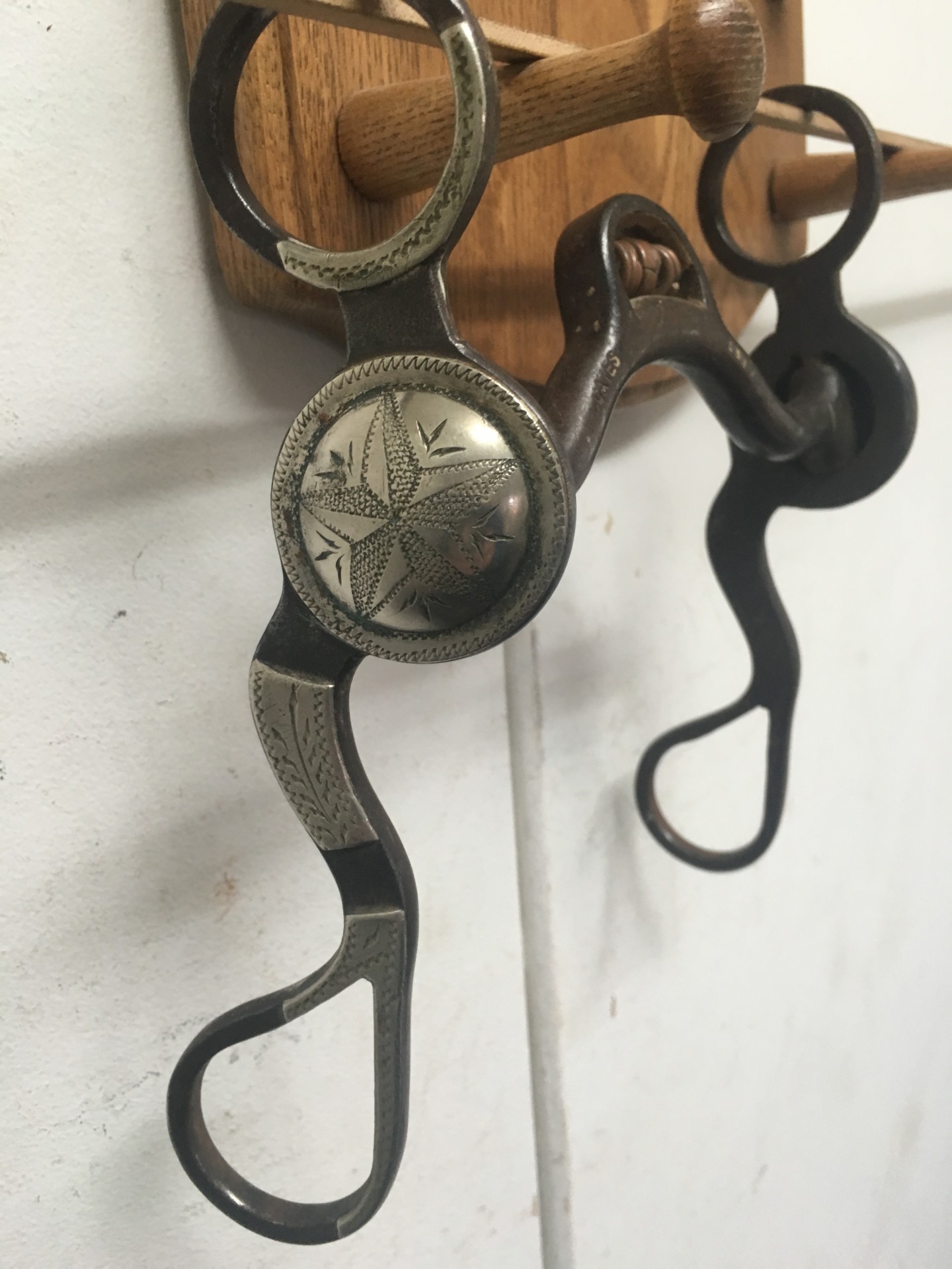 sale pending---Outstanding Jery Cates made bit, marked CATES #1519, with 7 1/4" cheeks, 5 3/16" mouth. This is one of the finest Cates bits I have seen. Never have seen this mouth before. Loose cheeks with domed conchos have a real good look. The late Jerry Cates is one of the top contemporary makers. We pay shipping within the 48 states and accept most forms of payment.