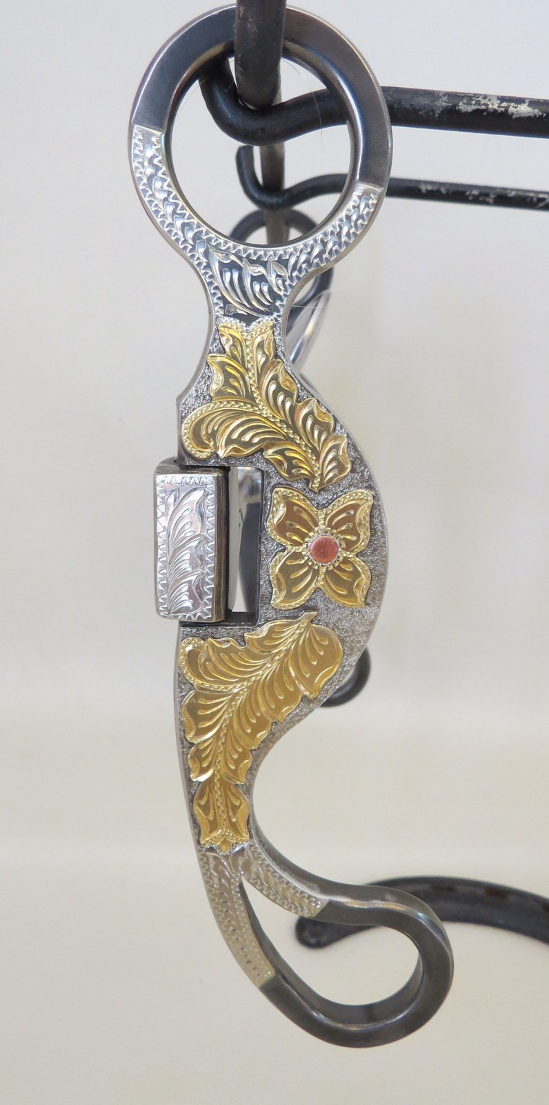 This is a new handmade floating spoon bit made by long time bit and spur maker Don Rogers from Hereford, Texas. Don has been building since 1975 and his work is sought after by cowboys and collectors alike. Don is listed in Bits and Spurs, Motifs, Techniques and Modern Makers by Ned and Jody Martin. The bit is marked Rogers inside the cheek piece. The bit is steel and the cheek pieces are overlaid with nickel silver. The nickel silver is mounted with brass flowers and leaves with a copper dot in the center of the flowers. This would be a nice to use or to add to a collection.