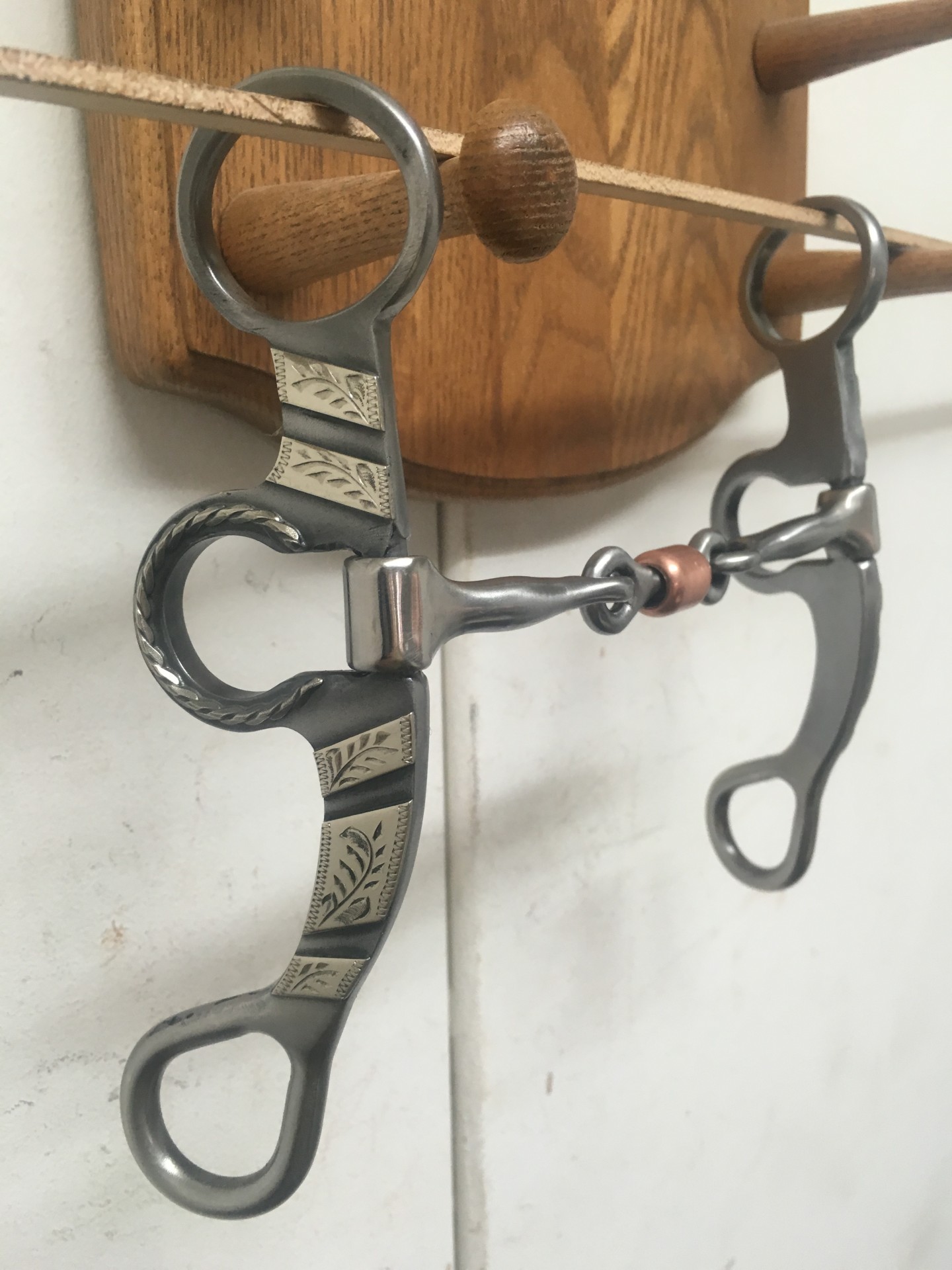 Unused bit marked HOBBS and made by Mick Hobbs, long time Oklahoma maker. His bits ride good!!. This one features hand engraved overlaid silver, 5 3/16" dog bone mouth, 6 5/8" cheeks. Handy using bit. We pay shipping within the 48 states and accept most forms of payment.