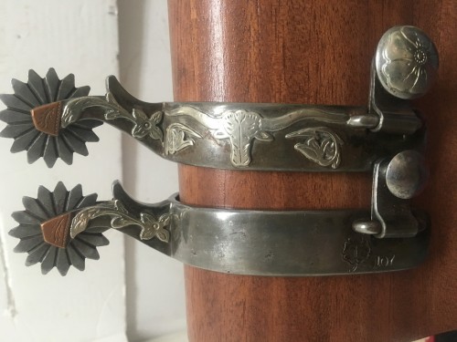 Spurs made by long time reputation maker Ron Tollison of Shamrock, Tx. They are marked with T inside a shamrock 107, in excellent condition, 3 1/4" heel openings, 7/8" bands, 1 3/4" shanks, 1 3/8" rowels. What a nice pair of spurs! Do not see that many of his on the market.