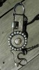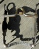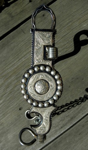 Nice, well made EG* Grijalva bit. Target pattern cheeks with full sterling inlay and overlay, conchos, all finely engraved. Nice double slobber chain. Grazing port mouth with roller; copper inlay on the back of the mouth piece and in the roller. Looks to have been used some, light surface rust in places, some of the bluing is worn, mostly on the inside of the cheeks. Ready to use or display.