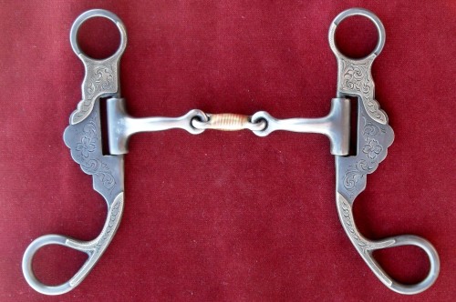 New unused dogbone shank snaffle by Gary Wiggins of Brewster, Kansas. Gary’s craftsmanship, silver work and engraving are second to none. This bit is no exception. Not only fine engraving in the silver but fine engraving in the steel as well. Measurements are 5” mouth, 7” cheeks. $395.00 includes shipping to the lower 48. Please view my other listings.