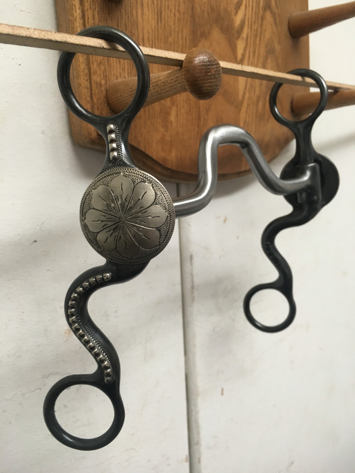 Gary Wiggins made bit that is marked WIGGINS 52.26.17. Gary is an award winning maker of quality bits and spurs. This bit features 6 1/2" cheeks and 5" mouth. 1 1/2" hand engraved conchos. We pay shipping within the 48 states and accept most forms of payment.