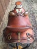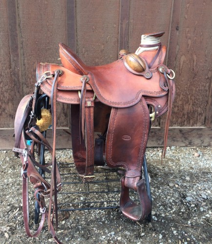 Genuine McClintock Mule saddle for sale. Wade tree; 16" seat; 4" horn; 4" cantle; 7/8 riggin; double skirt; double cinch, option of leather or rope; britchen; long strings; easy snaps. Call or text Paula 509-856-4141