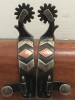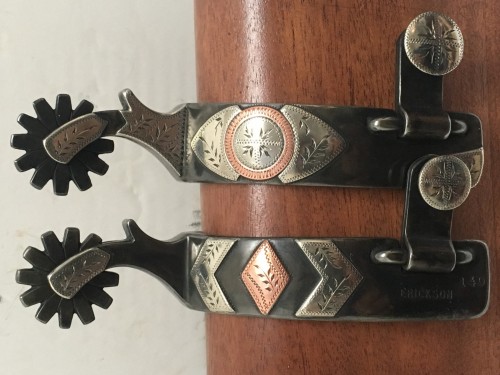 Unworn spurs marked ERICKSON 140 and made by Colorado maker Brad Erickson. Brad does good clean work and this pair is an example of that. 26 pieces of silver and copper overlays, 1" bands, 3 1/4" heel openings, 1 1/4" rowels, 1 7/8" shanks. Very nice pair with shorter shanks. We pay shipping within the 48 states and accept most forms of payment.