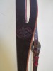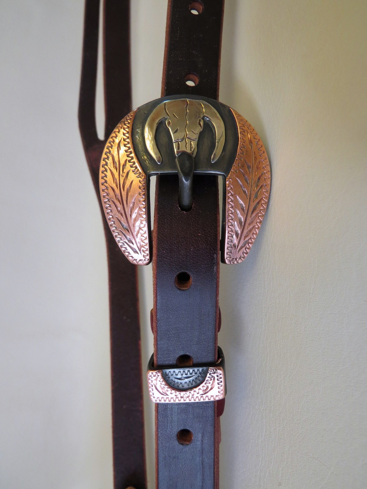 This is new handmade latigo shaped ear ¾” slot ear headstall with a new handmade marked buckle. The headstall is made from latigo leather and the bit attaches with latigo tie strings. The edges are beveled and hand rubbed. It was made by a grumpy old cowboy from Happy, Texas. He has been building cowboy gear since the 1970’s. It is marked with his stamp. The buckle was made by bit and spur maker David Hunt from Panhandle, Texas and is marked with his stamp. It is steel and is overlaid with engraved copper and a nickel silver bull skull. The buckle is attached to the headstall with latigo lace leather.