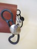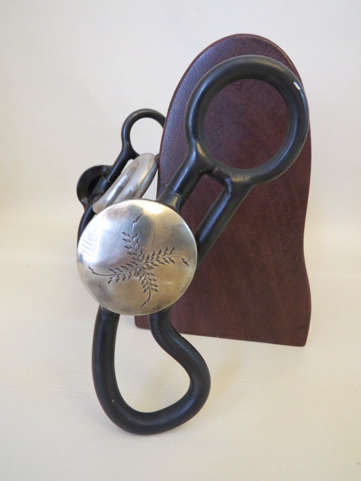 This is a new handmade bit made by Justin Hinkle from Altamont, KS. The bit is stamped JH and 2017 inside one cheek piece and stamped JH on the mouth piece. Justin has been building for a little over a year and is mostly self-taught. He favors Texas style engraving. He is part time maker and works on a ranch with his Dad and Uncle. Justin does nice clean work. This bit is steel with a dark iron finish and is mounted with an engraved nickel silver concho. The back of the port is inlaid with copper stripes. This would be a nice bit to use from an up and coming maker.