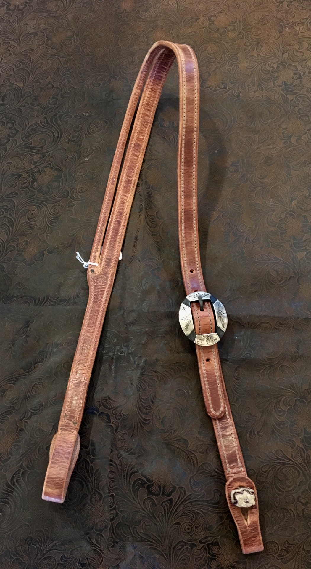 3/4" split ear headstall with hand-braided quick-change rawhide knots. Made by Terry Perschbacher of T&R Saddlery of Amarillo. Headstall is lined and is made out of harness leather. Buckle is 3/4", has German silver overlays and is made by Stephen White of Plainview.