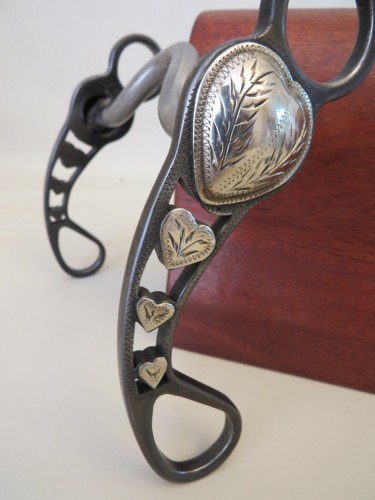 This is a very lightly used handmade loose cheek bit with a flattened rounded port mouth piece made by David Hunt of Panhandle, Texas. It is marked Hunt and his brand and the number 236 on the port. David is a well-known bit and spur maker and has been building for over a decade. David is among the select group of spur makers to provide spurs for the Texas Style Bit and Spur Makers Association Woman’s Protective Services auction along with other top makers. The bit is steel with a gray iron finish and is mounted with nickel silver. The top heart concho is domed. This would be a nice bit to use.