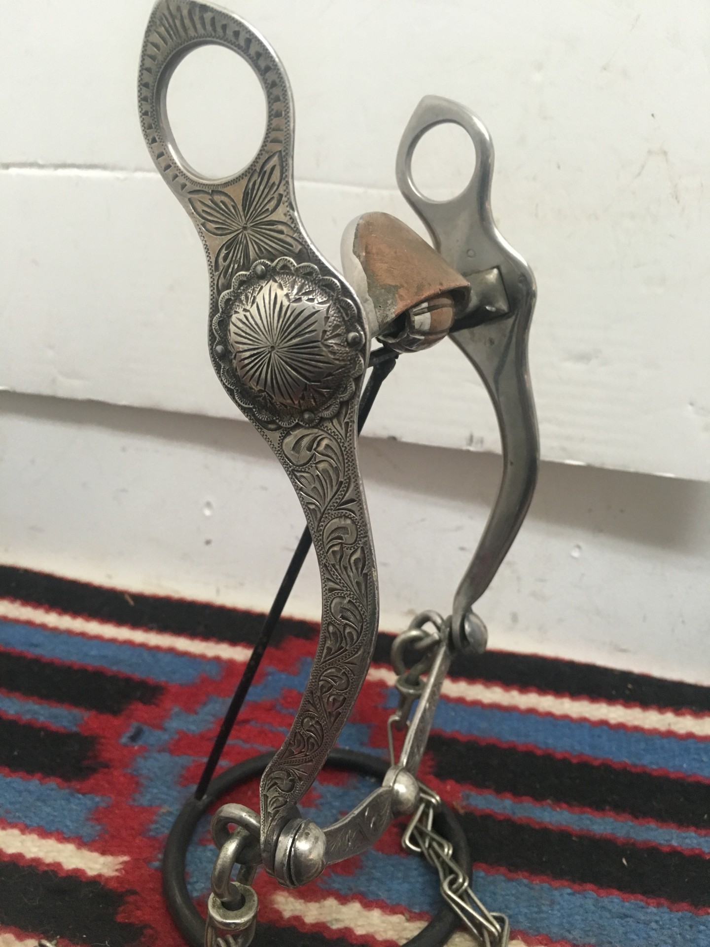 Good used GARCIA marked bit that has some age on it, sterling overlaid, very good rein chains, 7 1/8" cheeks, 5" mouth. Nice bit to use or add to your collection. We pay shipping within the 48 states and accept most forms of payment.