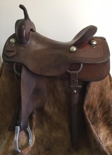 Used 16.5" RooHide Cutting Saddle $1500 Hard Seat, smooth with spider border, 3.5" horn, 6 3/4" gullet, built on Roo tree, back cinch included. $1500