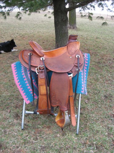 I have a custom Wade saddle. It does not carry a makers mark but is well built and weighs 36 lbs. with a rawhide covered tree. The person I bought it from purchased it while attending a Buck Brannaman clinic 10 years ago. It has a rawhide covered tree and is stamped with the number 1787 on the latigo keeper. Tooling is basket stamp with sunflower and floral pattern. Very unique, you won’t find another saddle quite like it.