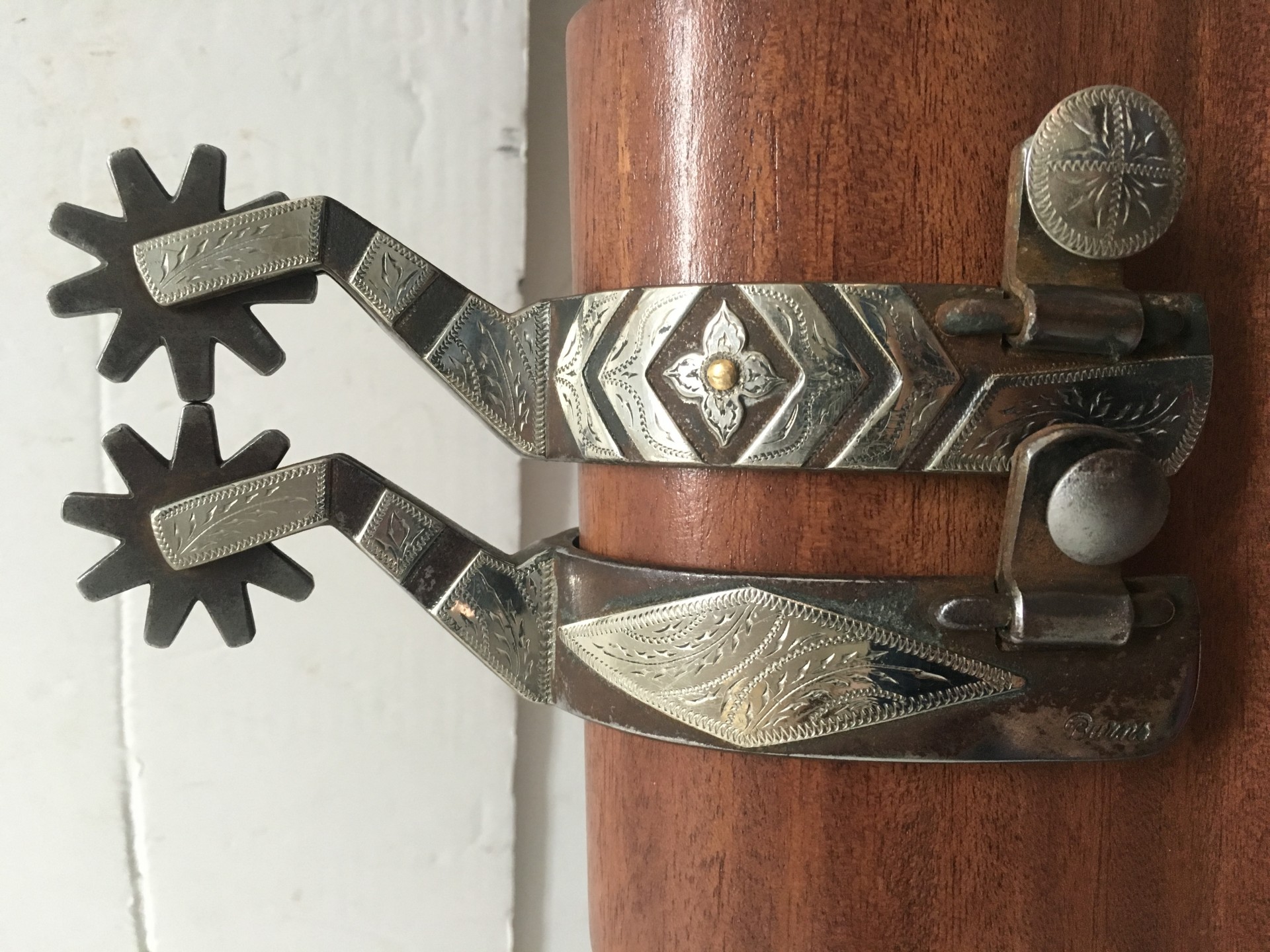 KEVIN BURNS SPURS: Good pair of BURNS marked spurs, made by Adolph Bayers award winner Kevin Burns. They have been worn enough to get some brown patina. Rowels are tight. Good used condition, no issues. 1" bands, 3 1/4" heel openings, 2 3/8" shanks, 1 1/2" rowels. We pay shipping within the 48 states and accept most forms of payment.