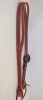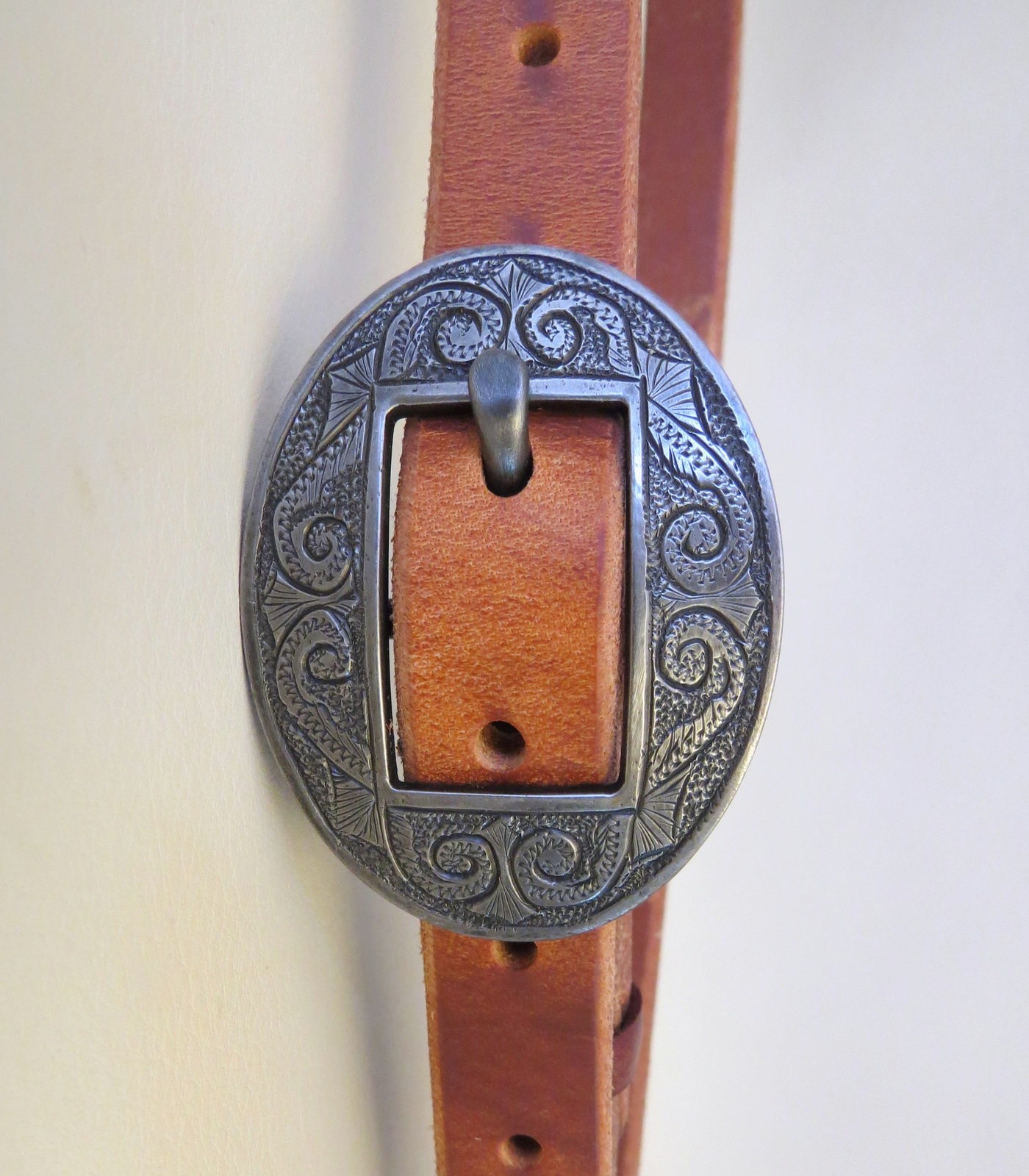 This is new handmade harness leather shaped ear ¾” slot ear headstall with a new handmade marked buckle. The headstall is made from harness leather and the bit attaches with latigo tie strings. The edges are beveled and hand rubbed. It was made by a grumpy old cowboy from Happy, Texas. He has been building cowboy gear since the 1970’s. He does a really nice job. It is marked with his stamp. The buckle was made by bit and spur maker David Hunt from Panhandle, Texas and is marked with his stamp. The buckle is engraved steel. The buckle is attached to the headstall with latigo lace leather.
