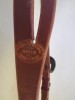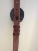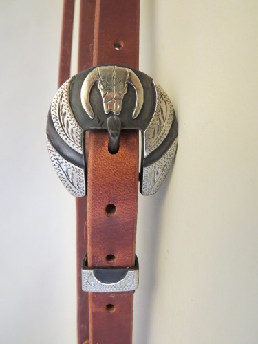 This is new handmade shaped ear ¾” slot ear headstall with a new handmade marked buckle. The headstall is made from heavy harness leather and the bit attaches with latigo tie strings. The edges are beveled and hand rubbed. It was made by a grumpy old cowboy from Happy, Texas. He has been building cowboy gear since the 1970’s. He does a really nice job. It is marked with his stamp. The buckle was made by bit and spur maker David Hunt from Panhandle, Texas and is marked with his stamp. The buckle is steel mounted with nickel silver. The buckle is attached to the headstall with latigo lace leather.