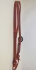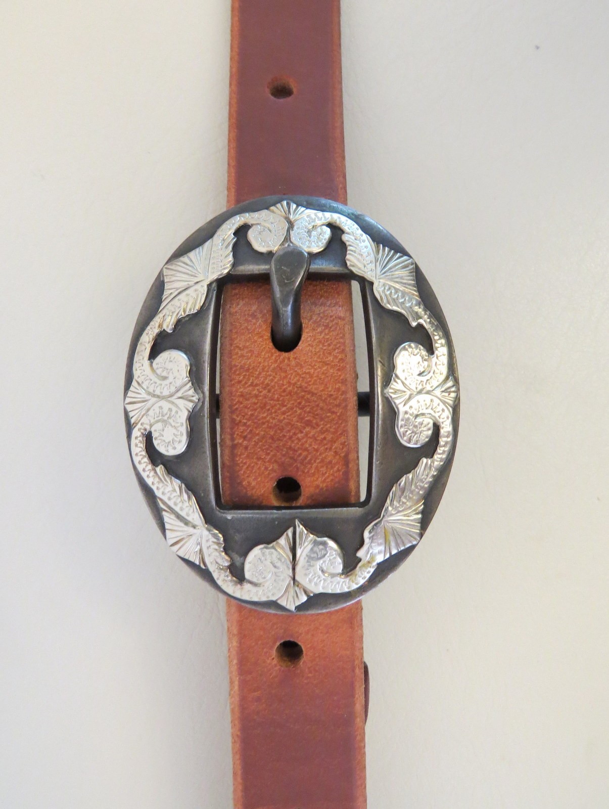 This is new handmade shaped ear ¾” slot ear headstall with a new handmade marked buckle. The headstall is made from heavy harness leather and the bit attaches with latigo tie strings. The edges are beveled and hand rubbed. It was made by a grumpy old cowboy from Happy, Texas. He has been building cowboy gear since the 1970’s. He does a really nice job. It is marked with his stamp. The buckle was made by bit and spur maker David Hunt from Panhandle, Texas and is marked with his stamp. The buckle is steel mounted with nickel silver. The buckle is attached to the headstall with latigo lace leather.