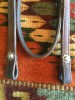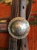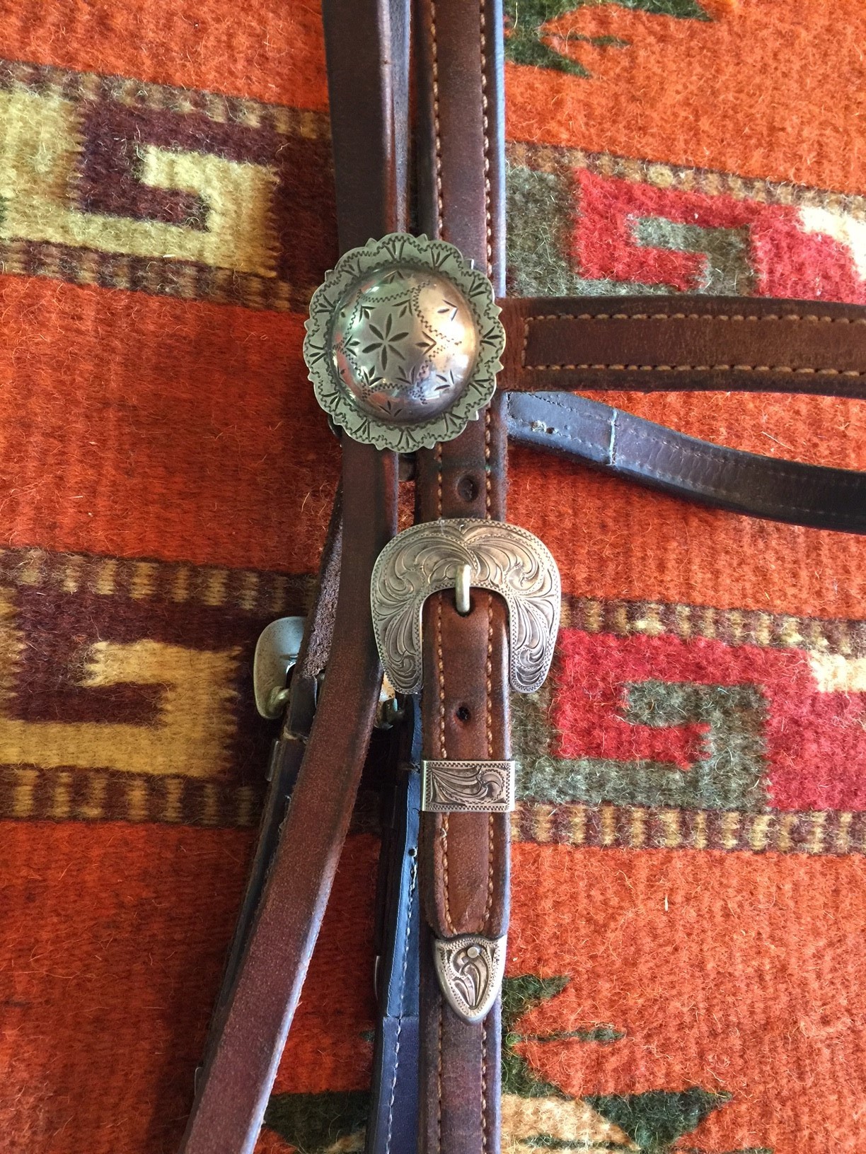 Nice 5/8" stitched harness headstall made at Jay Palm’s Saddle Shop. Two 1 3/4" Sterling marked bridle conchos as you can see from the pictures. Cheeks have 2 Sterling 3/4" Overlay buckles, tips and keepers. Throatlatch has the same buckle but in a 1/2" size. Bit ends have two 5/8" sterling conchos on chicago screws.