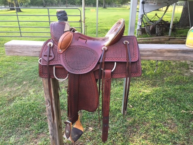 Used 16” wade by Meridian Saddle Co. out of California. Saddle is in excellent shape and is ready to use. It has metal clad wooden stirrups, bucking rolls, twisted and tied stirrup leathers, 6 sets of strings, 28-1/2" long skirts, mule wrapped horn, extra set of stirrups (taps) they need a new string on one of the conchos and breast collar. If you need additional photos or info, I’ll be happy to assist the best I can. Weight is 47 lbs.