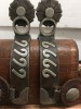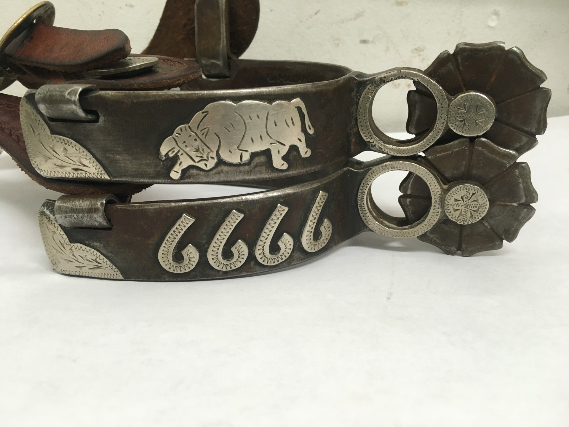 Cool pair of spurs that are in good used condition, mounted with the Bayer’s style bull and the 6666 brand. Marked D.POLLARD 1055 MERKEL TX. 1 11/16" shanks, 1" bands, 3 5/16" heel openings, 1 1/2" rowels. Straps included. We pay shipping within the 48 states and accept most forms of payment.
