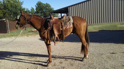 Sorrel 3yr old colt with just a handful of rides. He is riding well, and is about ready for a job. I picked him up in Oklahoma and he had been ridden in the Arbuckle Mountains. He was very thin when I bought him, but he has picked up quite a bit since I have had him. He is a very gentle well-bred colt that will make someone a good horse. Give me a call and I can tell you a little more about him.