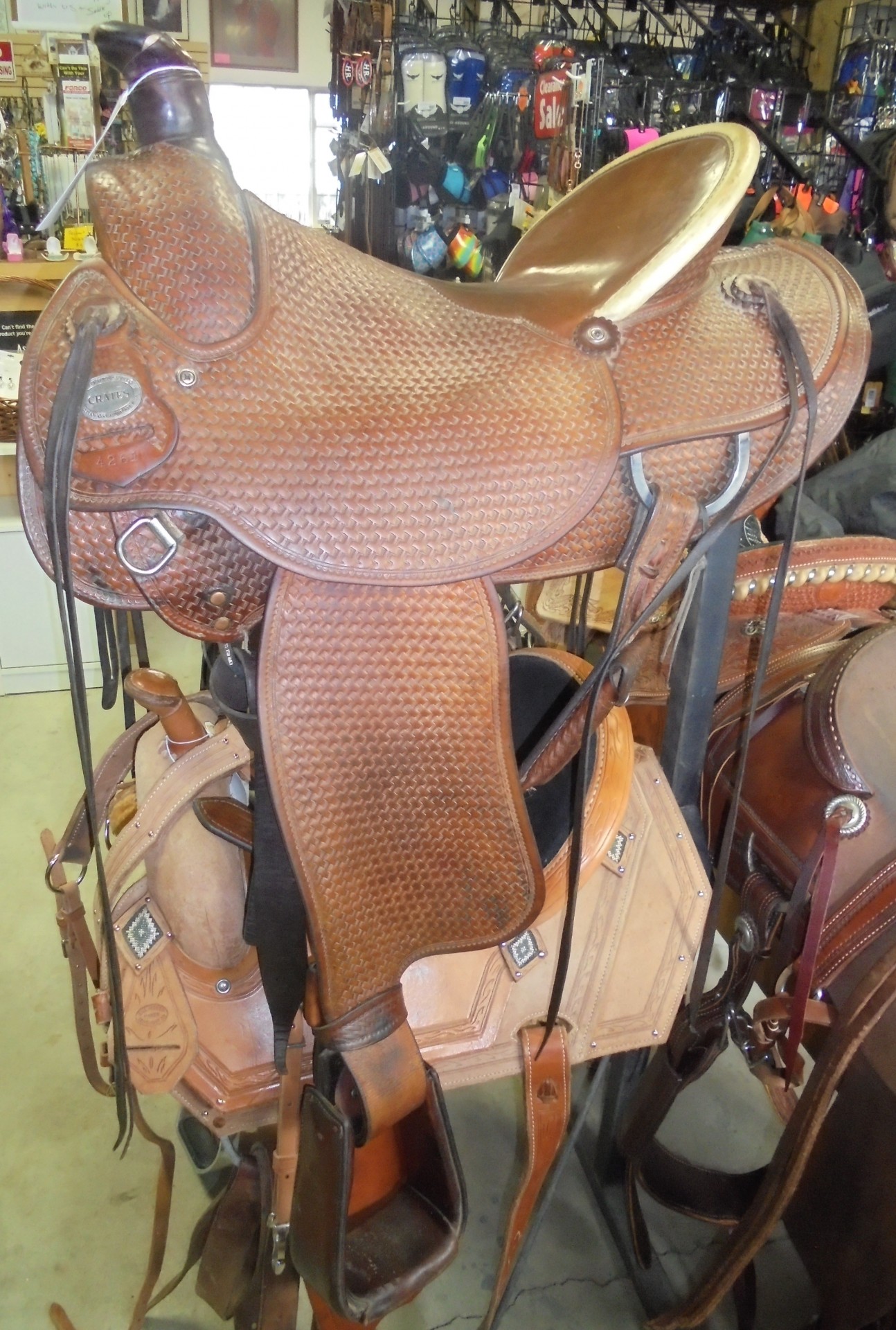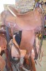 This A fork style roping saddle is made by Crates is comfortable and durable! Ride in this saddle all day long in comfort. Makes a great ranch saddle to rope out of and push cattle. Leather is in great supple condition and is fully basket weave tooled with a leather are seat.