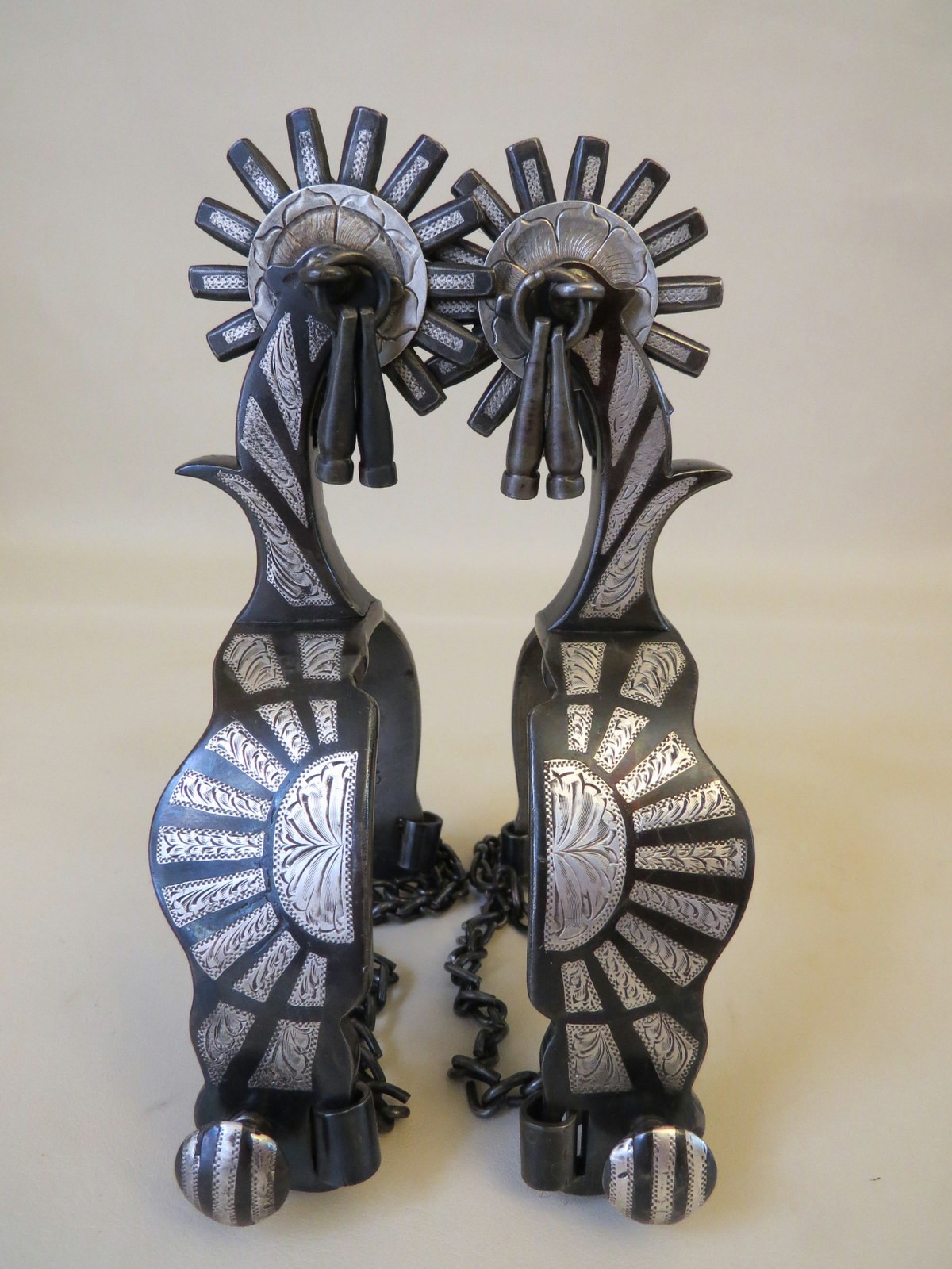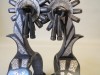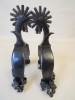 Measurements: Heel Band Width at Shank 1”, Heel Band Width at Widest 1 ⅜”, Shank 2 ⅜”, Rowels 2”, Rowel Points 14, Heel Opening a little over 3 ¼”, Weight of both spurs 1lb 8.5oz