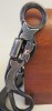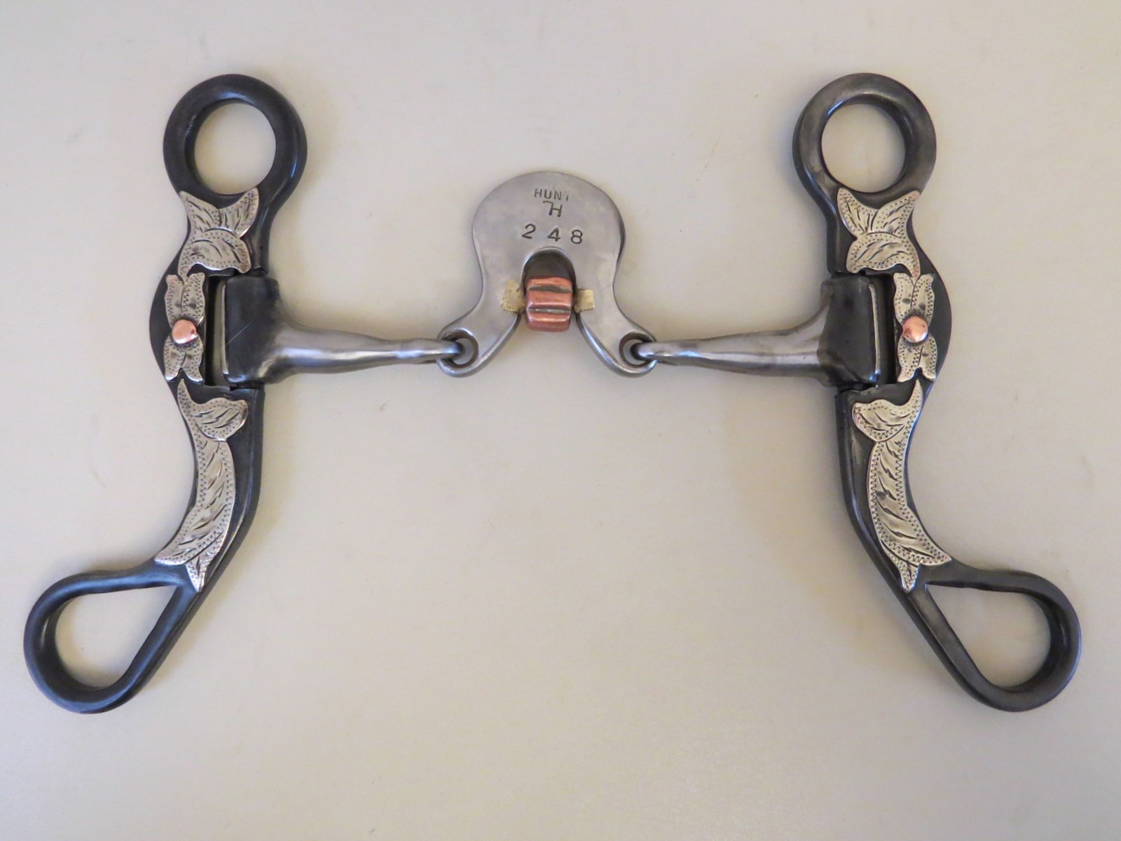 This is a new handmade floating spoon or spade bit made by David Hunt of Panhandle, Texas. It is marked Hunt and his brand and the number 248 on the spoon. David is a well-known bit and spur maker and has been building for over a decade. David is among the select group of spur makers to provide spurs for the Texas Style Bit and Spur Makers Association Woman’s Protective Services auction along with other top makers. The bit is steel and is mounted with an engraved nickel silver flower and leaves with a copper dot in the center of the flower. There is engraving in the steel between the mountings. The spoon has a copper roller. This would be a nice bit to use.