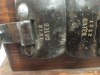 JERRY CATES MOUNTED SPURS: Used spurs marked CATES 1212, with 1 1/8" bands, 1 3/4" rowels, 2 1/2" shanks, 3 1/4" heel openings. Rowels and pins are good, some wear scratches. Nice pair to wear or add to your collection. Made by one of the top makers in the past 50 years, The late Jerry Cates is honored at the National Cowboy Museum and Heritage Center. We pay shipping within the 48 states. We accept most credit cards, Pay Pal, money order, check.