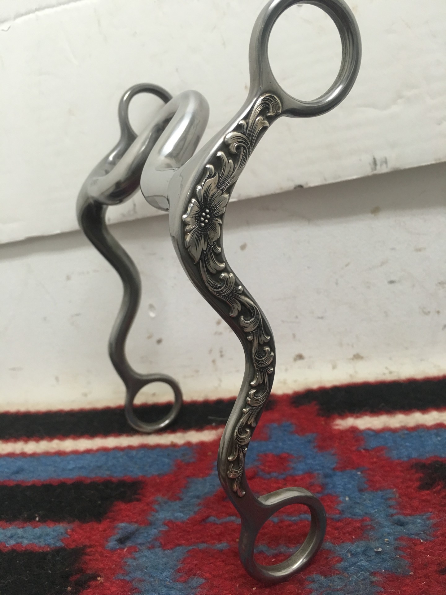 Jerry Falkner made bit that is marked FALKNER and unriddened, with 7 1/8" cheeks and 5 1/8" mouth. He is definitely one of the best makers going, as can be seen by the quality of both the silver and the steel work. First one of his bits I have ever owned, hard to find. We pay shipping within the 48 states and accept most forms of payment.