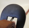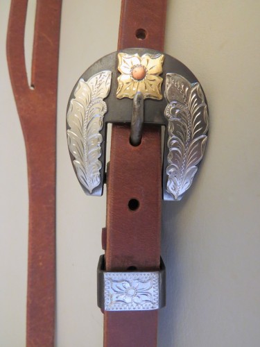 New handmade heavy harness leather shaped ear slot ear ¾” headstall with a handmade buckle made by Don Rogers. Don is a long time bit and spur maker from Hereford, Texas. Don has been building since 1975 and his work is sought after by cowboys and collectors alike. Don is listed in Bits and Spurs, Motifs, Techniques and Modern Makers by Ned and Jody Martin. The back of the buckle is marked Rogers. It is steel mounted with a brass flower with a copper center and nickel silver leaves. The buckle is attached to the headstall with latigo lace leather. The headstall is made out of really nice quality heavy harness leather. The edges are beveled and hand rubbed. It has straight bit ends and the bit attaches with latigo tie strings. It was made by Grumpy Old Cowboy from Happy, Texas. He has been building cowboy gear since the 1970’s and does a really nice job. It is maker marked with his stamp.