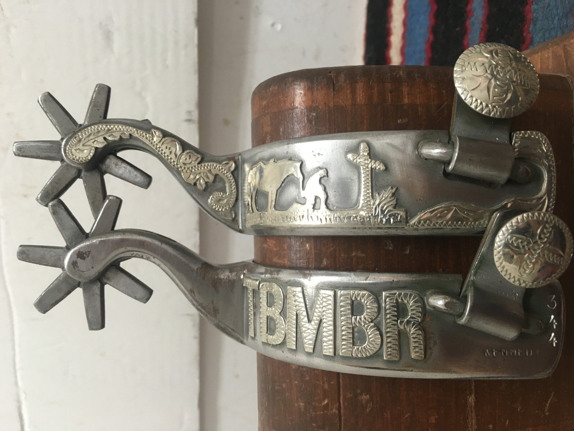 Unworn spurs made by Shawn Kennedy for the Tom Butler Memorial Bronc Riding. They are marked KENNEDY 344. Nice pair of spurs by a quality maker with 1 1/8" bands, 1 3/4" 7 pt. rowels, 2 1/4" shanks, 3 3/8" heel openings. The initials are easily removed, if so desired. This a nice pair of cowboy tools. We pays shipping within the 48 states. We accept most credit cards, Pay Pal, money order, check.