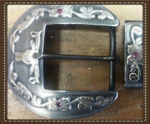 Handmade 1-1/2" Belt buckle, made of mild steel. Nickel silver mountings w/ lab grown rubies.